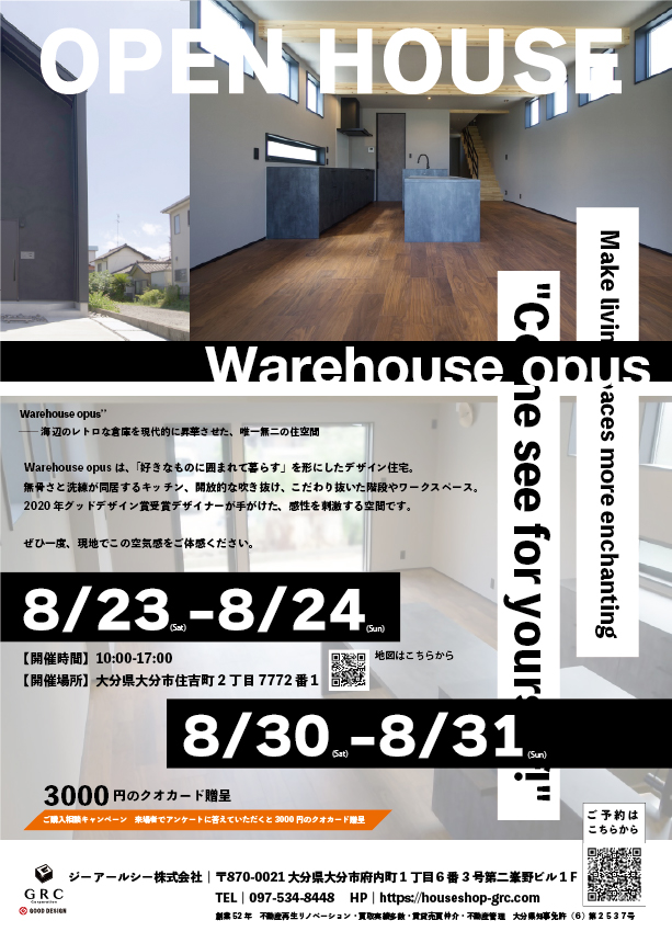 【オープンハウスのご案内】新築完成見学会開催 2025/08/20 【オープンハウスのご案内】 Warehouse Opus 住吉 新築完成見学会 開催 日頃よりジーアールシーをご愛顧いただき、誠にありがとうございます。 このたび、当社のこだわりを詰め込んだ新築物件「Warehouse Opus 住吉」がついに完成いたしました。 つきましては、下記日程にて**オープンハウス(完成見学会)**を開催いたします。 「住むことを楽しむ」をテーマにした、洗練された空間をぜひご体感ください。 開催日程 2025年8月23日(土) 2025年8月24日(日) 2025年8月30日(土) 2025年8月31日(日) 開催時間 午前10時 〜 午後5時(事前予約要) 会場 大分市住吉エリア(詳細はスタッフまでお尋ねください) 見どころポイント 人気のWarehouseシリーズ最新作 シンプルかつ機能的なデザイン デザインと快適性を両立した家づくりの理想形 最新の住宅設備・素材へのこだわり ご来場特典あり アンケートご記入の方へ、ささやかなプレゼントをご用意しております。 ジーアールシーは“喜びを集める住まいづくり”をお届けします。 皆さまのご来場を、スタッフ一同心よりお待ちしております。 お問合せ:097-534-8448(営業時間:9:30~17:00/定休日:日・月・祝) オープンハウスのご来場予約はこちらから https://calendar.google.com/calendar/u/0/appointments/schedules/AcZssZ0r54Lb4mNPjXj_r8UZ5rCdZ9QgNlayYLUahU8uhhezr6bCit7qr489UFsVoqMkhJEfrYjIdaVN